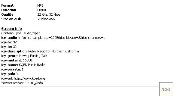 | Description | As User reported that http://kqed-ice.streamguys.org:80/kqedradio-ch-e1 Is not working with MediaMonkey but it works with AIMP Radio Link source is http://www.kqed.org/radio/listen/ Attached Stream Info from AIMP (MP3, 22knz, 32Kbit, Mono) NOTE: I also got MediaMonkey Crash/Lock when I tried to play it. | ||||