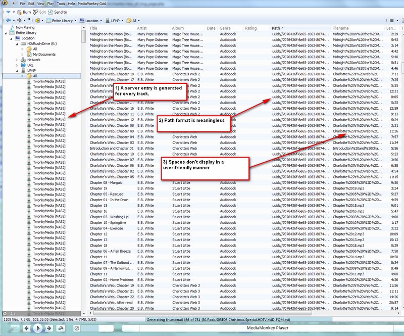 | Description | If UPnP servers are scanned into the library, there aren't represented in a useful manner. We should either: a) fix this b) disable UPnP scanning until we fix this Specific issues are: 1) A server entry is generated for every track scanned 2) Path format is confusing. It might be better to show something like \\UPnP\<server>\path 3) Spaces in the path/filename don't display in a 'friendly' manner. See the attached screencap. | ||||