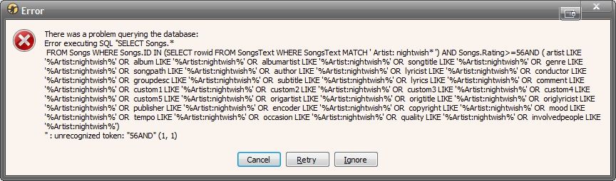 rating:3.. +nightwish fails with an SQL error due to missing space. Reported here: http://www.mediamonkey.com/forum/viewtopic.php?f=7&t=54322 |