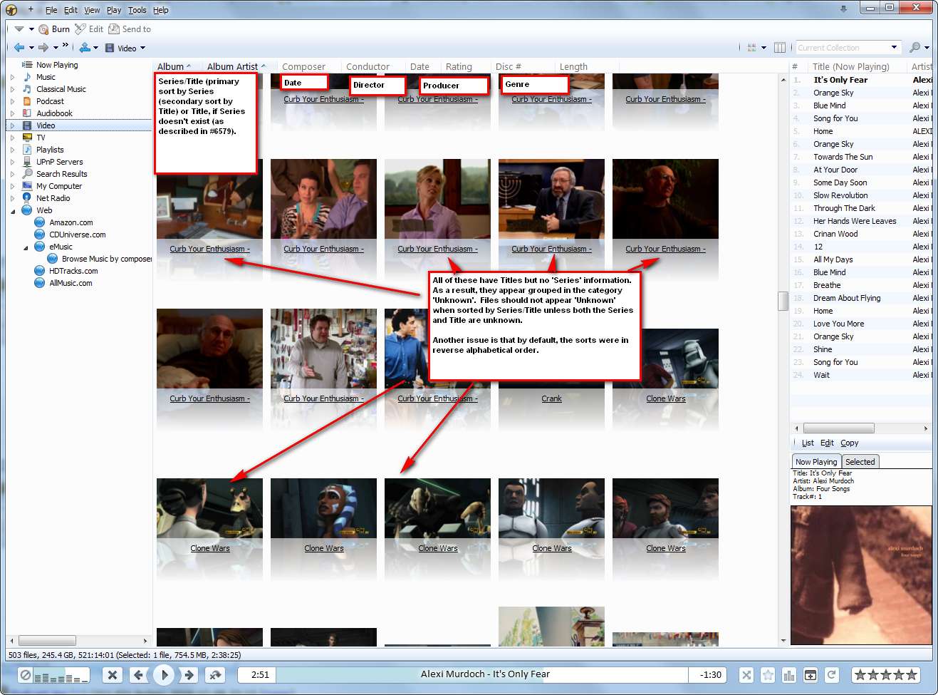 Tested 1334. Much better, but a couple of items remain: Video: -Default sort is by Date and Director. It should be by Series/Title. -Column for Series/Title isn't enabled / doesn't exist in AA view. -There seem to be 2 groups in Video: 1) Unknown 2) W That shouldn't be the case. They should be grouped by Series, otherwise not at all (i.e. just alphabetical). Though perhaps no grouping at all might be better. Playlists: The playlist 'View as' setting has no effect. e.g. Playlist set to 'Classical' doesn't appear like the Classical collection. TV: Second column should be 'Series' or 'Series/Season' rather than 'Series/Title' |