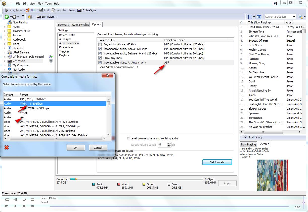 Tested with Zen vision in 1336, and I noticed what may be a problem: WMA file is listed as a supported format, but no audio format is associated with the WMA file (same goes for AA file). Is that valid ? |