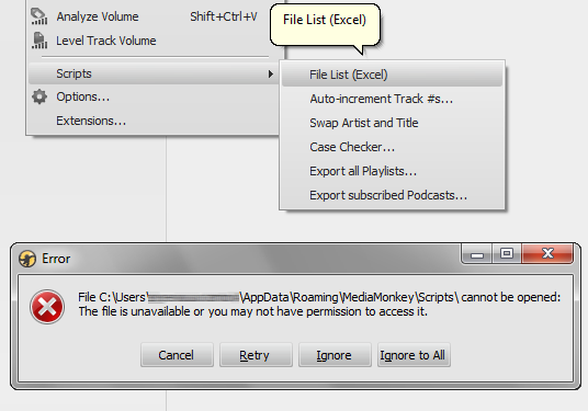 | Description | In build 1361, 'Filelist (Excel)' menu entry appears erroneously in 'Tools > Scripts' Menu. Clicking on this item, throws an error, stating the file doesn't exist or is not accessible. The same entry also appears in 'File > reports' and works correctly. | ||||