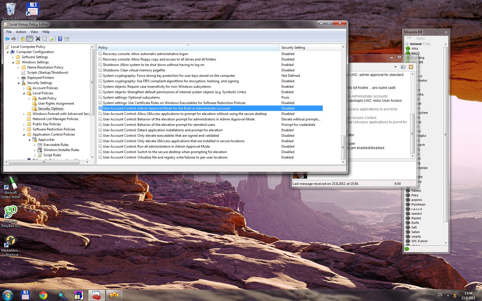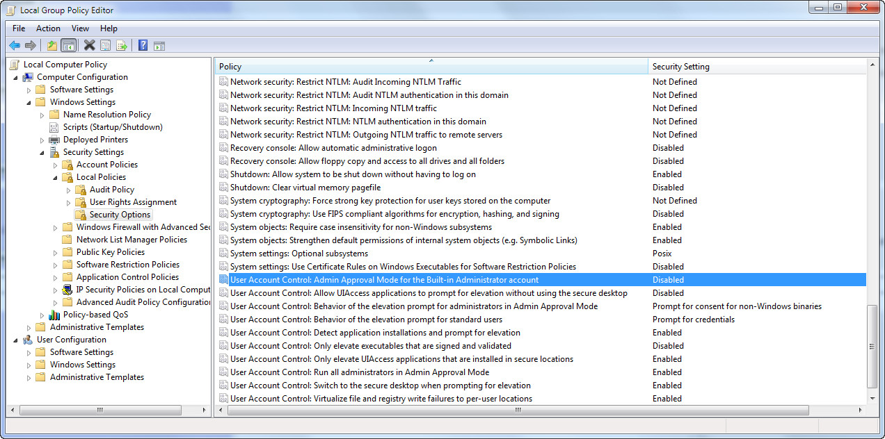 I don't fully understand what the issue is for you. 1. Do you say that it doesn't associate even when you install MM? 2. And does it associate if you run cmd and type 'MediaMonkey.exe /elevate'? 3. I attached screenshot of the default security settings, please run 'gpedit.msc' and check whether you have the same settings. Note that only the lines with leading 'User Account Control:' are interesting. |