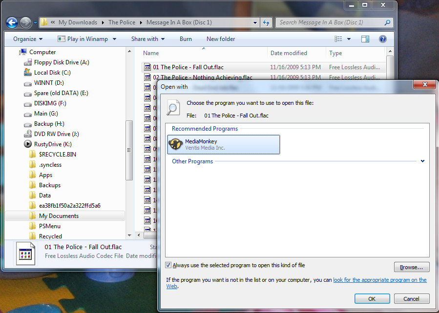Tested 1424 and MM still fails to associate correctly on this machine. When I implement associations manually via Windows, it works as expected. Edit: to clarify: even on installing MM (rights are elevated), MP3 files do not get associated with MM. Edit2: interestingly upon manually associating file types (e.g. Flac with mediamonkey--see attached image), MediaMonkey is listed by default as a preferred application for the given filetype even though it isn't actually associated. i.e. MM is presumably updating some registry entry that makes it 'preferred' for a filetype, but isn't actually making the association--that must be done manually. |