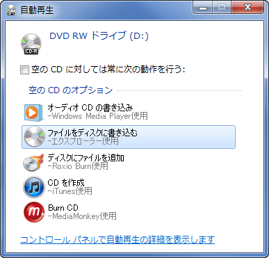 | Description | The customer requested that "CD burning" in the Windows Auto-Run dialogue that appears when a blank CD is inserted into Drive be translated into Japanese. | ||||