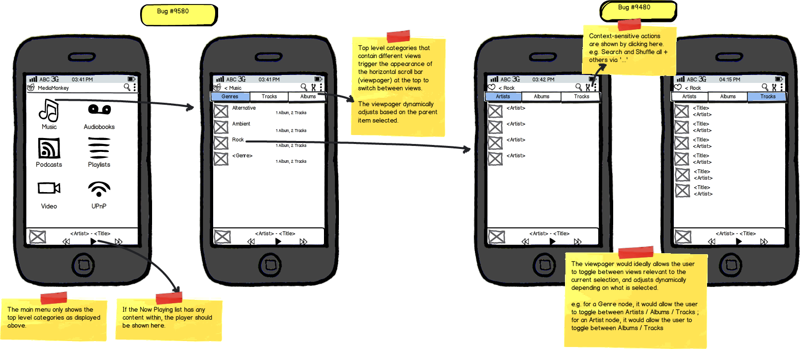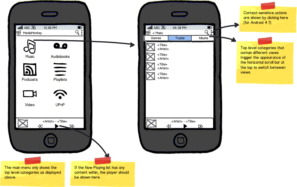 | Description | The main menu currently has too much on it / isn't well organized, and doesn't look nearly as slick as the default Android 4.1 media player. The suggestions below will hopefully deal with this: 1) Content is mixed with commands: There is all sorts of content displayed, but there is also a 'Sync Now' command that doesn't really fit with the rest of the items. I would suggest that this be moved to the context/actions menu. 2) The screen is overloaded with content options (the home screen doesn't fit on most phone screens and requires scrolling): One way to fix this is to split up the various 'Nodes' so that fewer are on display. I would suggest the following organization. MediaMonkey - Music (main menu item) - Albums (horizontal selector item--viewpager) - Artists (horizontal selector item--viewpager) - Composers (horizontal selector item--viewpager) - Genres (horizontal selector item--viewpager) - Tracks (horizontal selector item--viewpager) - Audiobooks (main menu item) - Podcasts (main menu item) - Video (main menu item) - UPnP (main menu item) ? Playlists ? could be a main menu item (if they're designed to be media independent) OR within each Media type (if they're mostly specific to each type of media). See attached image. 3) App isn't immediately content centric: a) When run for the first time, the app should display the Music > Artists view (instead of showing a less interesting menu). b) If the application is closed/restarted, it should re-open in the same view last used. | ||||